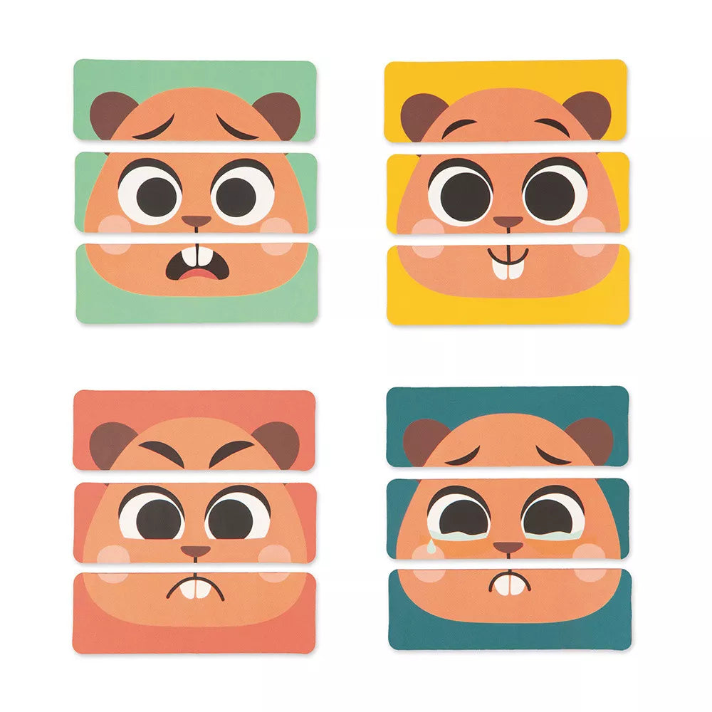 El rompecabezas con 4 ilustraciones para ordenar representa 4 emociones importantes, como la alegría, la tristeza, el miedo y la ira, y enseña a reconocer las emociones.