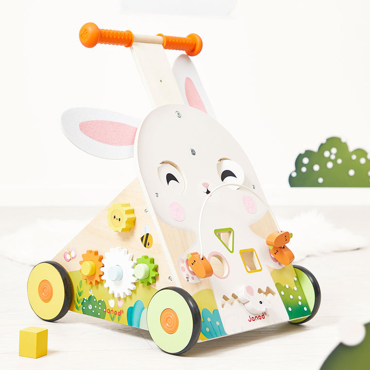 El empujador de madera con forma de adorable conejo es un juguete multifuncional que favorece el desarrollo del bebé en muchos aspectos.