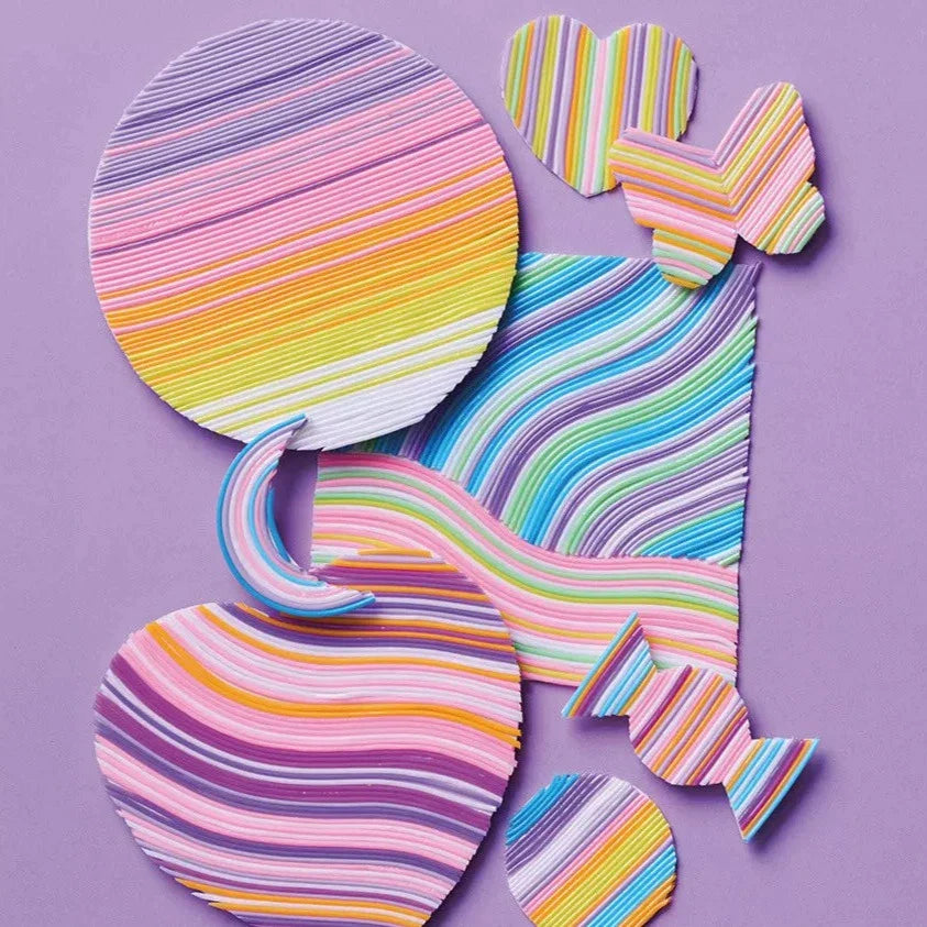 La diversión consiste en pegar los cordones a lo largo de las líneas marcadas, creando originales decoraciones con forma de arcoíris.