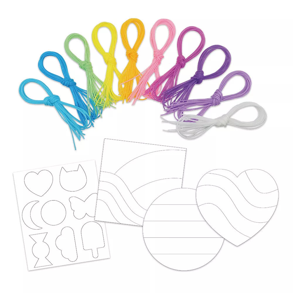 - El set incluye: 3 tableros (un cuadrado, un corazón y un círculo con líneas en superficies autoadhesivas), un tablero con 8 pegatinas y 60 cuerdas artesanales, llamadas scoubidous (es decir, líneas trenzadas) en diferentes colores pastel.