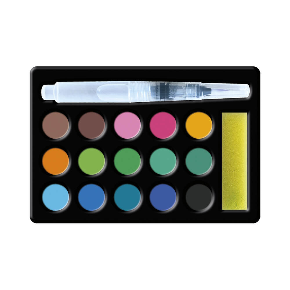 El set incluye: 2 tableros-imágenes, paleta de acuarelas con 15 colores, esponja pequeña, marco para fotos.