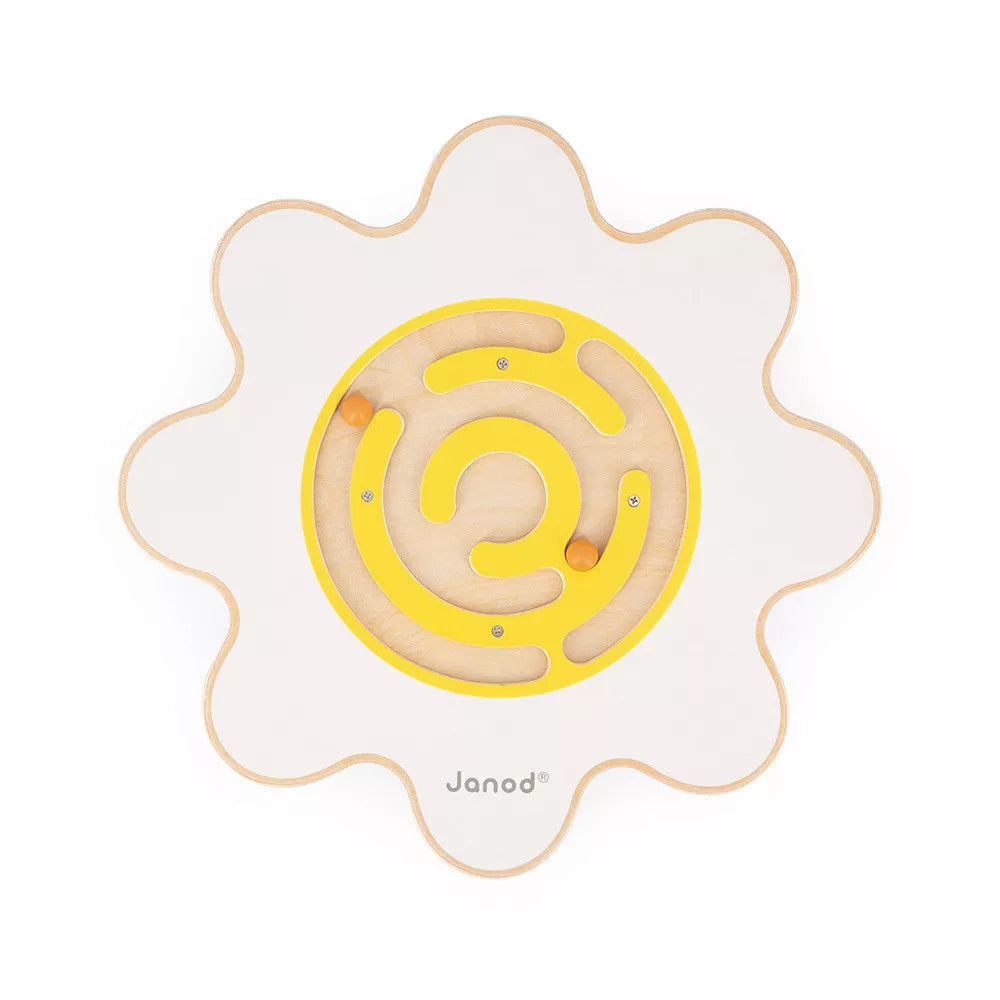 La tabla de equilibrio infantil de Janod, con una base semicircular, tiene forma de flor con bordes redondeados, pétalos blancos y un laberinto amarillo con dos bolas que se mueven en su interior.