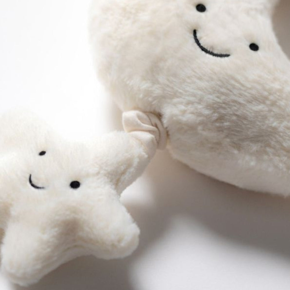 Suave y agradable al tacto, la luna abraza con delicadeza a una estrella cremosa y esponjosa, creando el conjunto perfecto para abrazar y apretar.