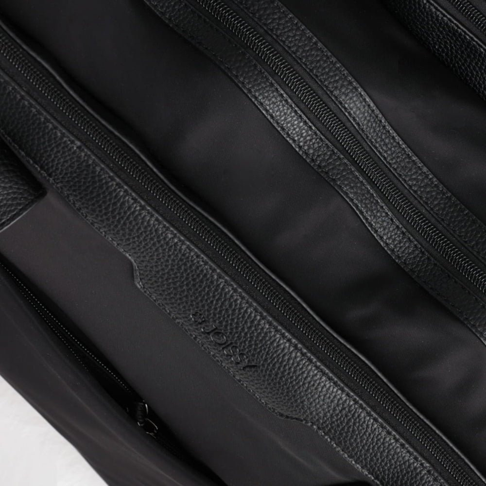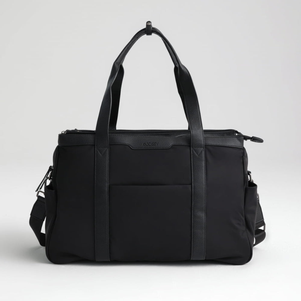 Fabricada en nailon de alta calidad, resistente al agua y fácil de limpiar, con accesorios de cuero ecológico.