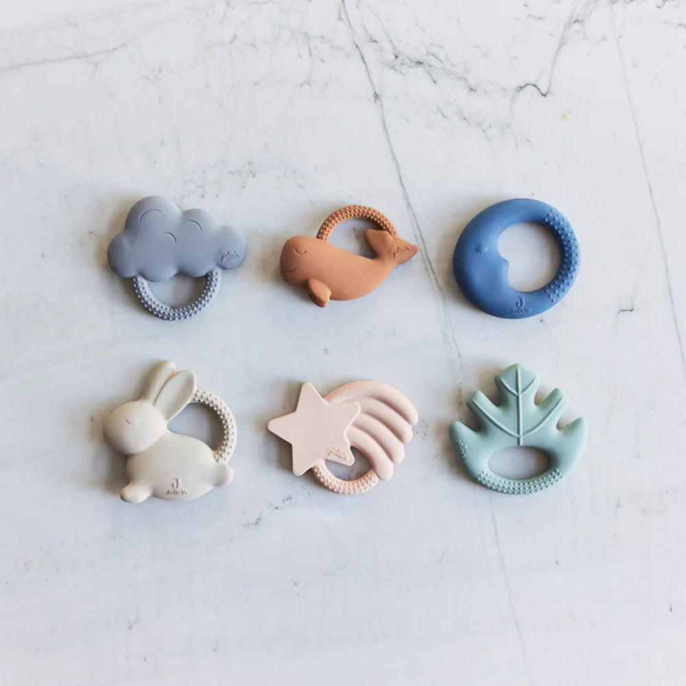 El mordedor para bebés Jollein está disponible en seis formas únicas, cada una con su propio color.