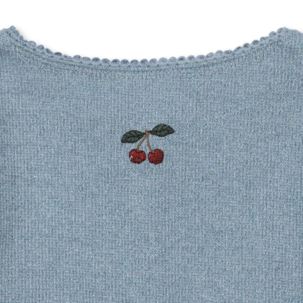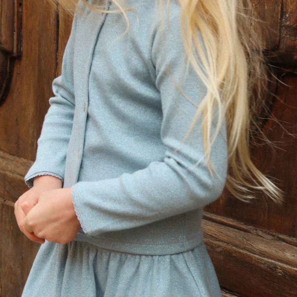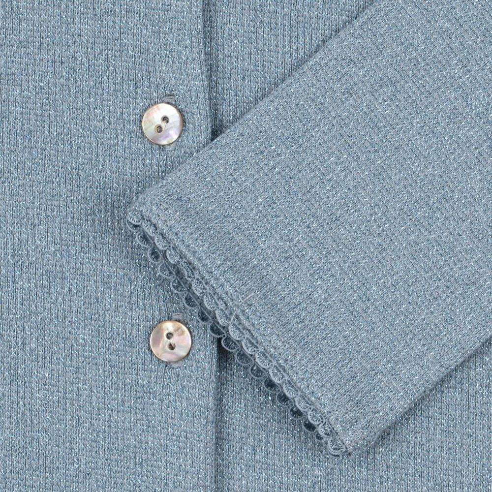 El sutil brillo del lurex le da un toque elegante, mientras que los ribetes decorativos en el escote resaltan su silueta ligera y femenina.