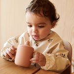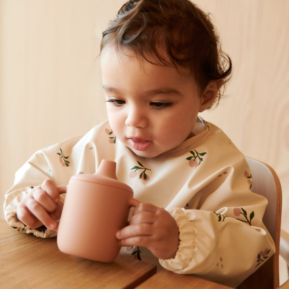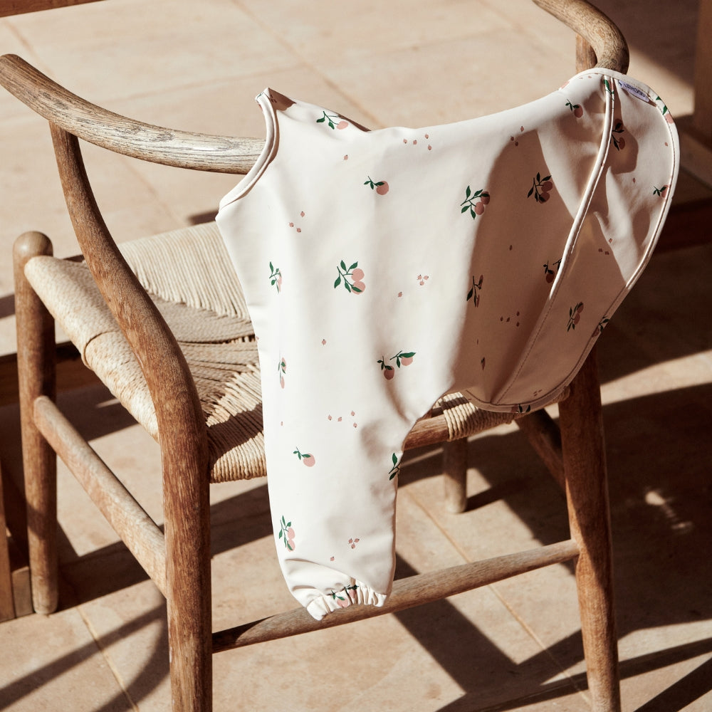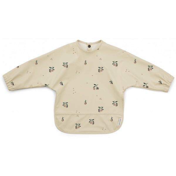 El babero con mangas de Liewood presenta un bonito motivo beige melocotón.