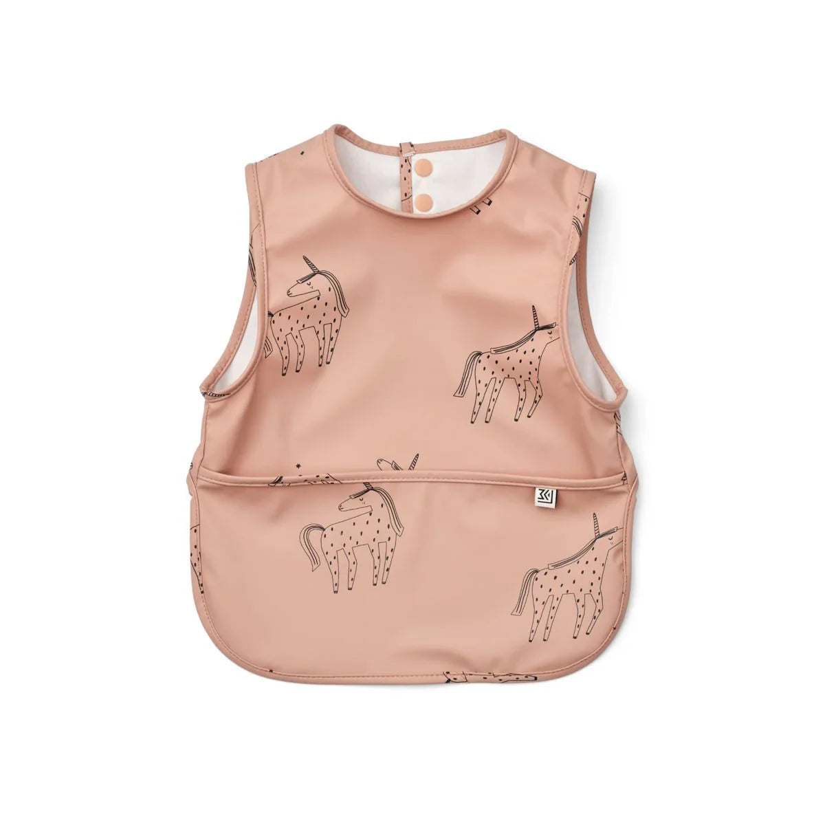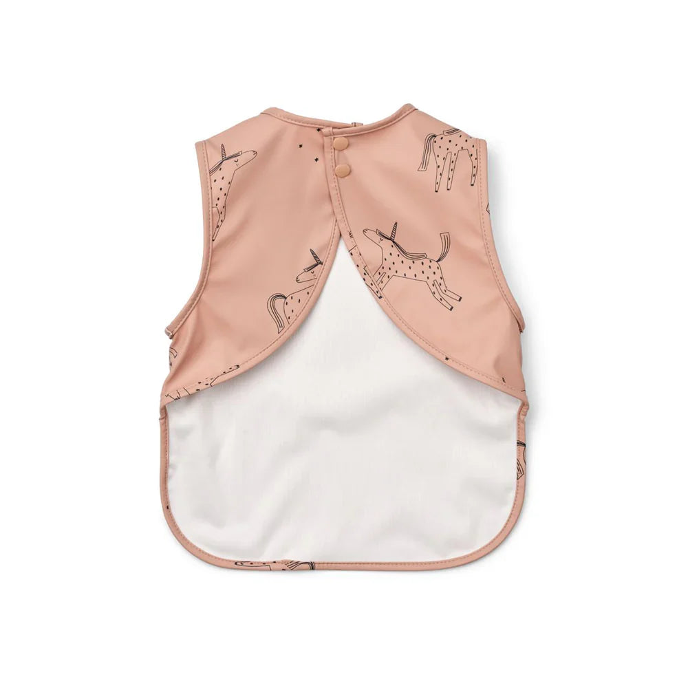El babero sin mangas Unicorn Pale Tuscany con práctico bolsillo para restos de comida de Liewood es cómodo y funcional a la vez.