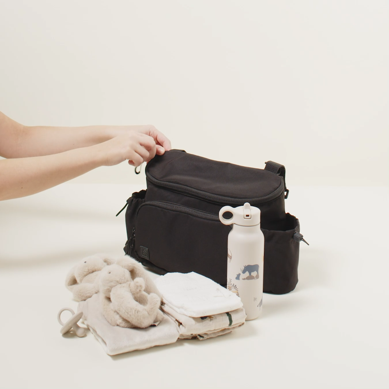 La bolsa Mummy Bag tiene un discreto cierre de velcro para fijarla fácilmente al cochecito, lo que la hace ideal para paseos o salidas con el bebé.