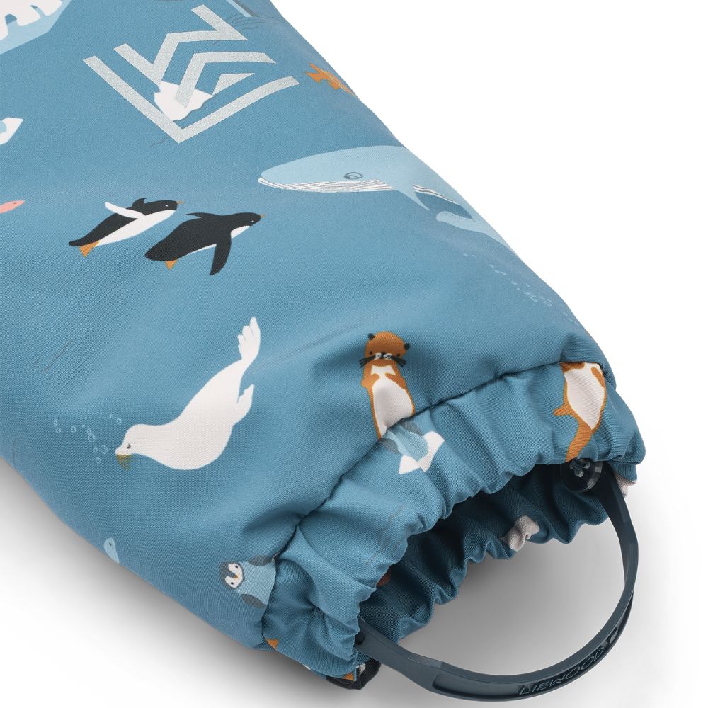 Su índice de impermeabilidad de hasta 12 000 mm de columna de agua protege contra la humedad cuando se juega en la nieve o bajo la lluvia, mientras que el forro polar del interior de los bolsillos y las correas ajustables de silicona para los pies evitan que entre agua y mantienen los pies del niño secos y calientes.