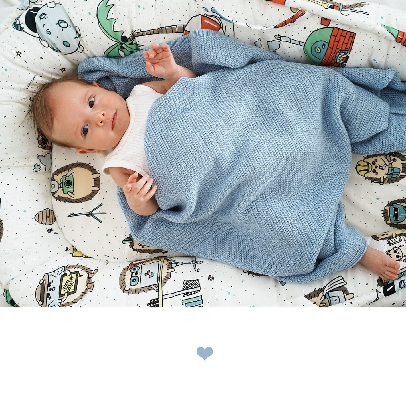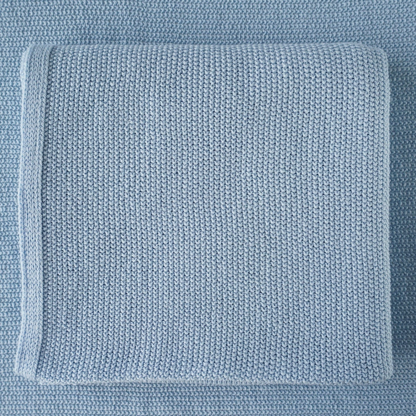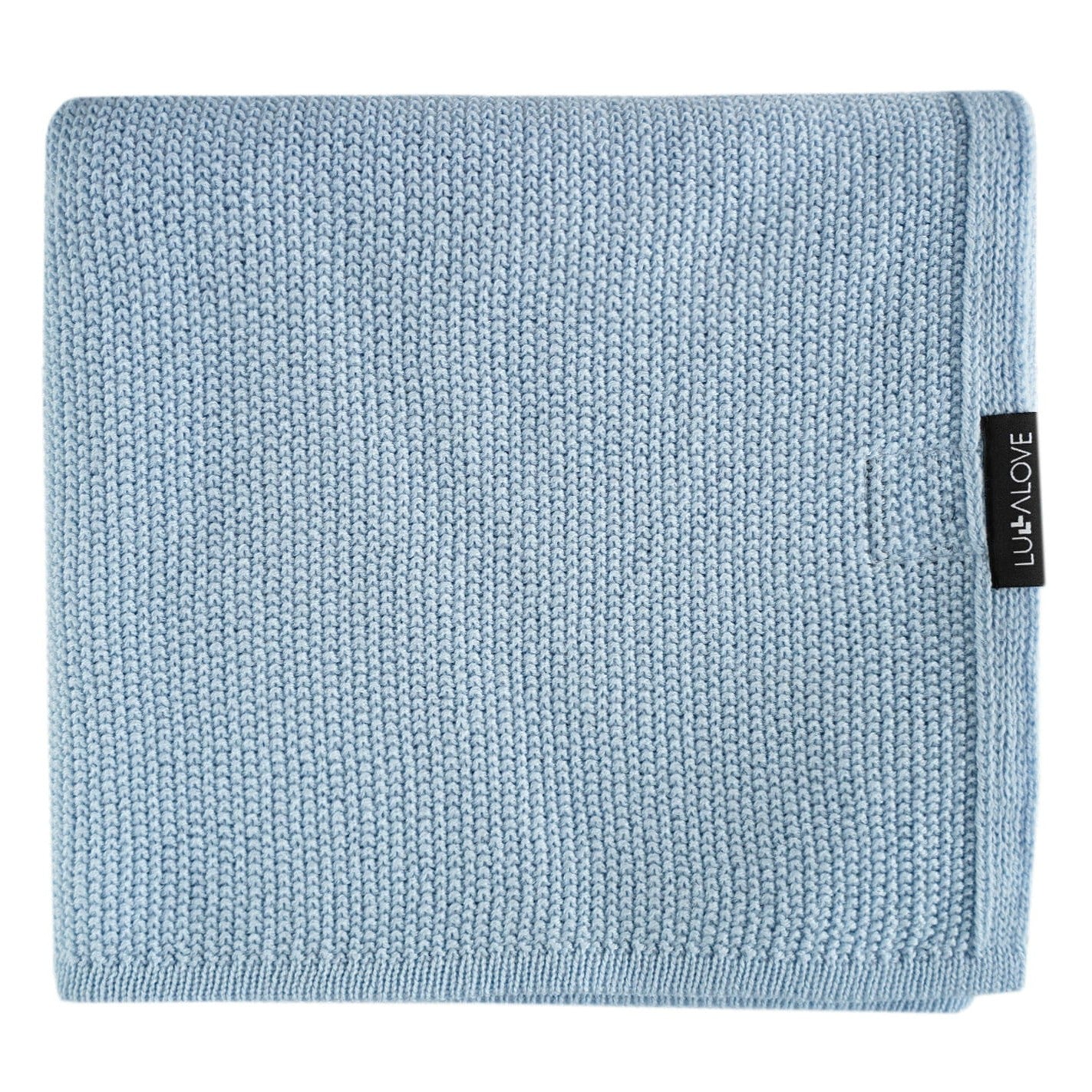 La suave manta de lana merino también se puede utilizar como mantita para bebés en color azul nube de LullaLove.