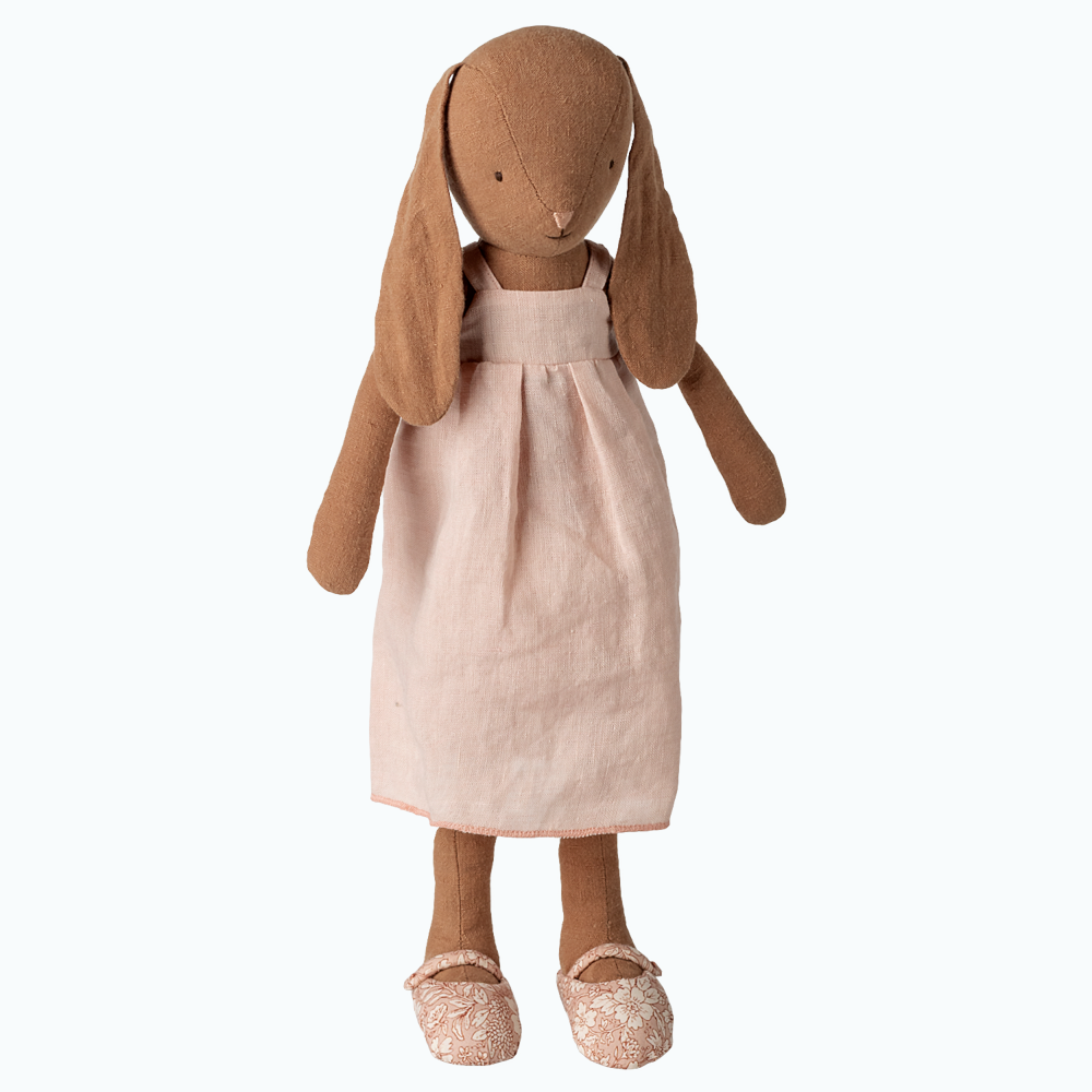 El conejito Maileg con vestido y zapatos es un peluche clásico y suave hecho de tejidos naturales que transmite una sensación de calidad y calidez desde el primer contacto.