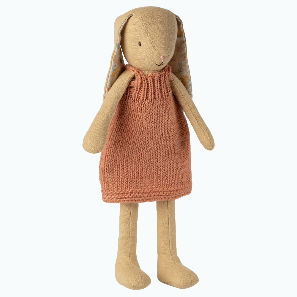 Con una altura de 26 cm, el conejito con vestido encaja perfectamente en la Casa en Miniatura y en los muebles en miniatura y en miniatura de Maileg: puedes crear escenas enteras en la casa e invitar a tus personajes favoritos a entrar.