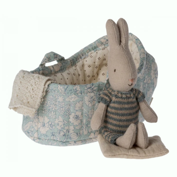 Conejito Micro Bunny con ropa azul oscuro y transportín de Maileg.