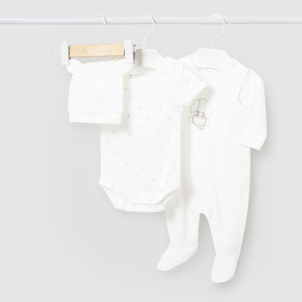 Conjunto para bebé compuesto por pelele, body y gorrito Ecru de Mayoral.