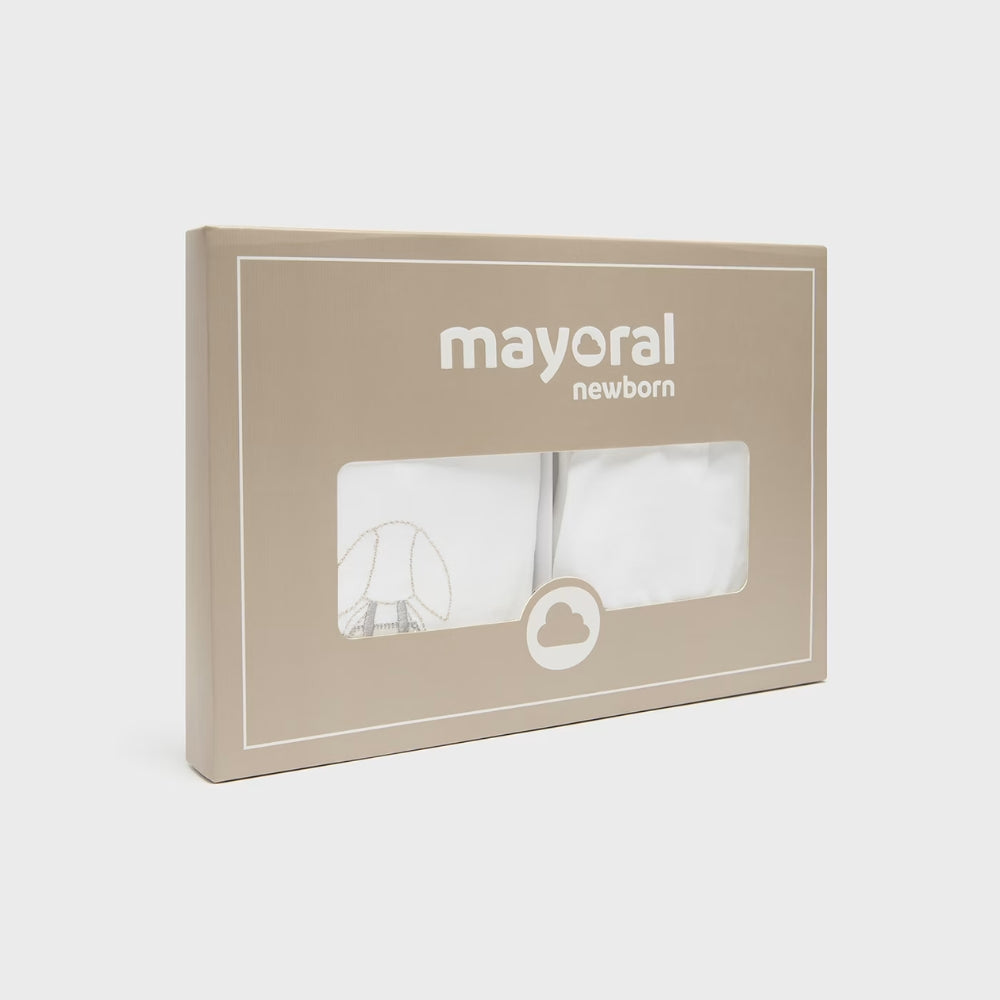 El conjunto de Mayoral consta de un pelele, un body y un gorrito, ideales para la siesta y el juego.