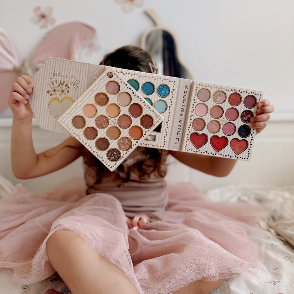 Contiene hasta 50 sombras de ojos y faciales en una variedad de colores llenos de brillo y energía. Con esta paleta, los niños pueden crear sus propios looks, desarrollar su sentido de la estética y pasar tiempo divirtiéndose de forma creativa.