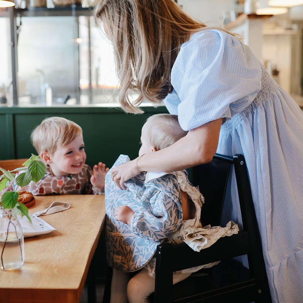 Gracias a su amplio bolsillo, la comida no acaba en el suelo y el babero Mushie protege eficazmente toda la ropa.