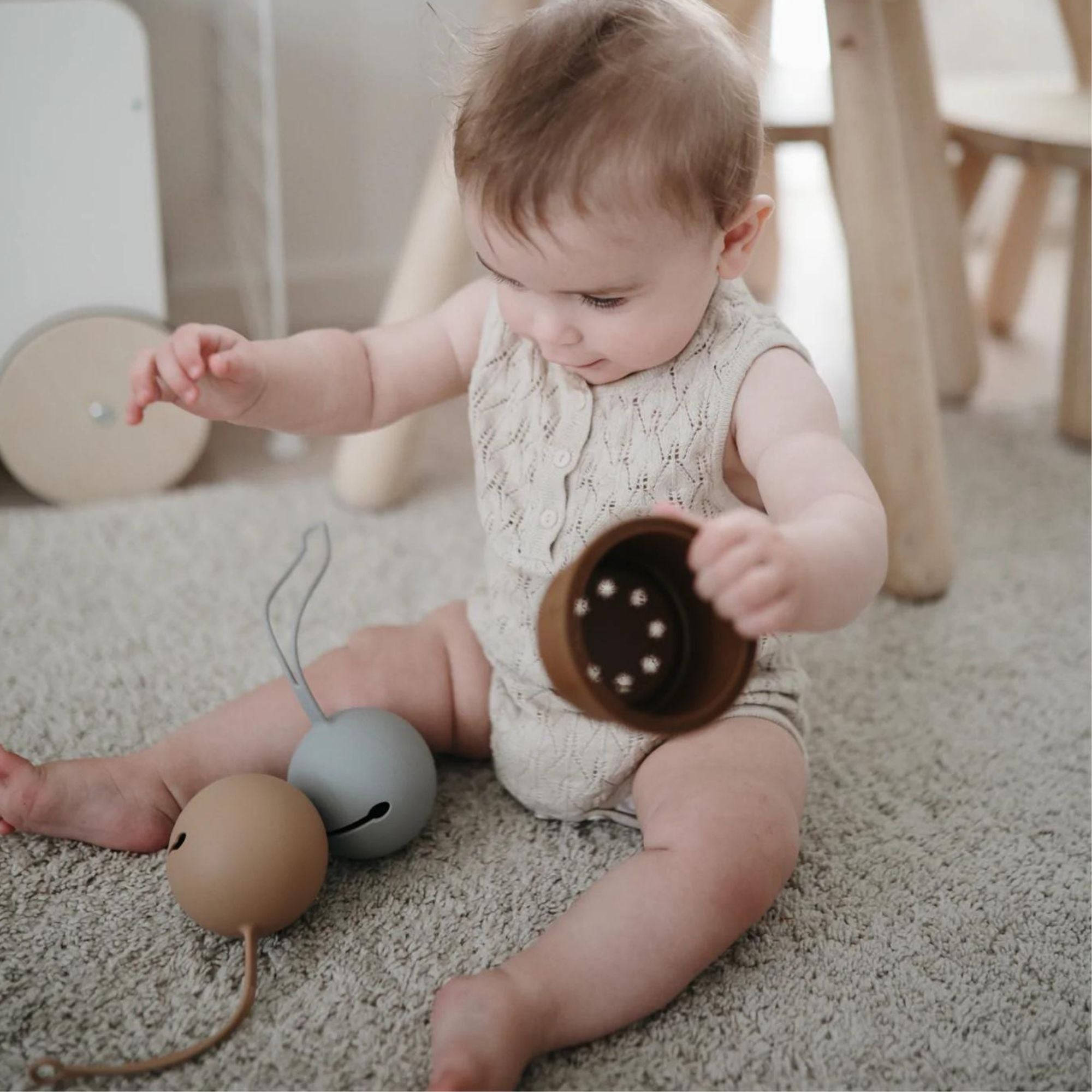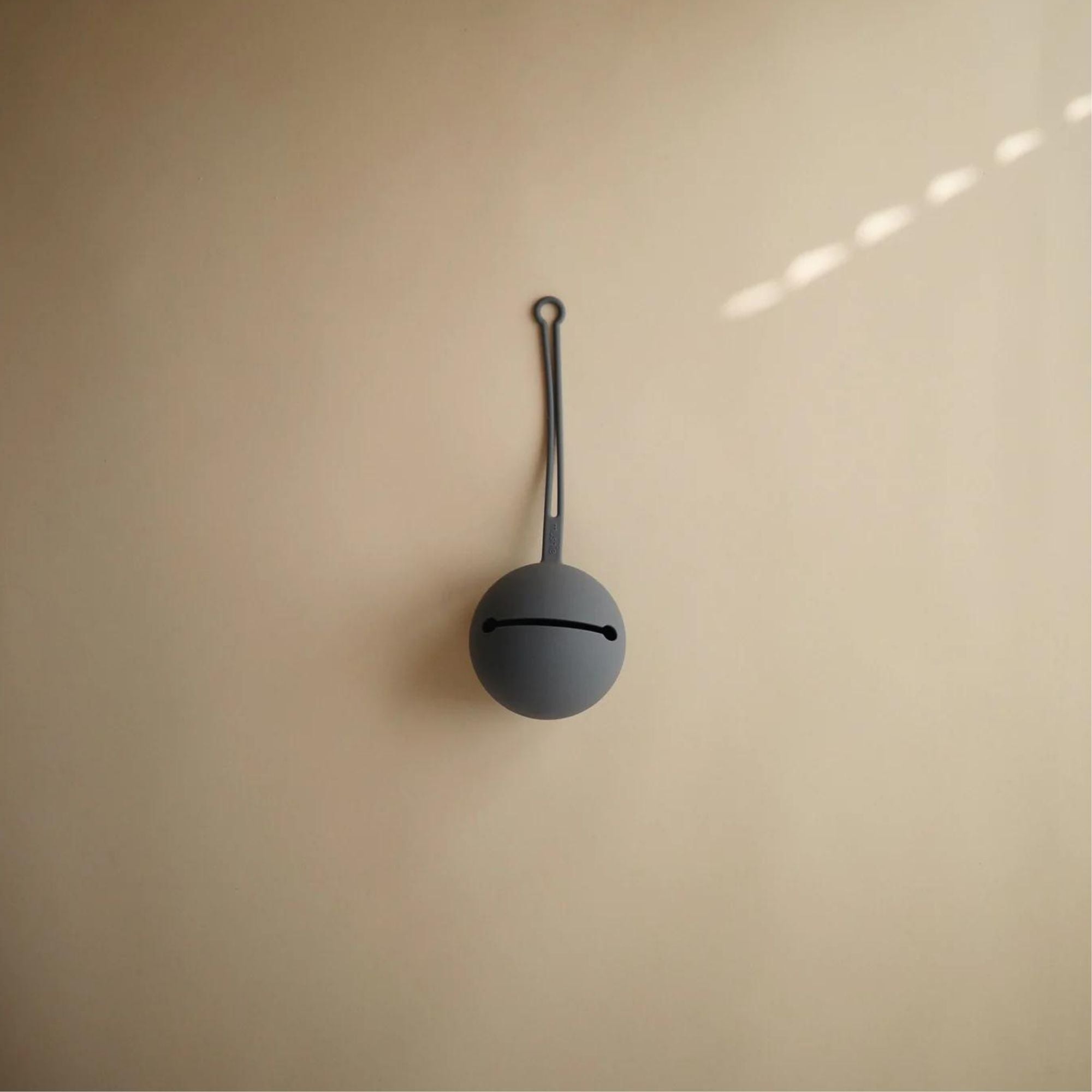 El estuche para chupetes Ball Tradewinds de la marca Mushie cuenta con un cierre especial que permite fijarlo al cochecito, la cuna o cualquier otro lugar.