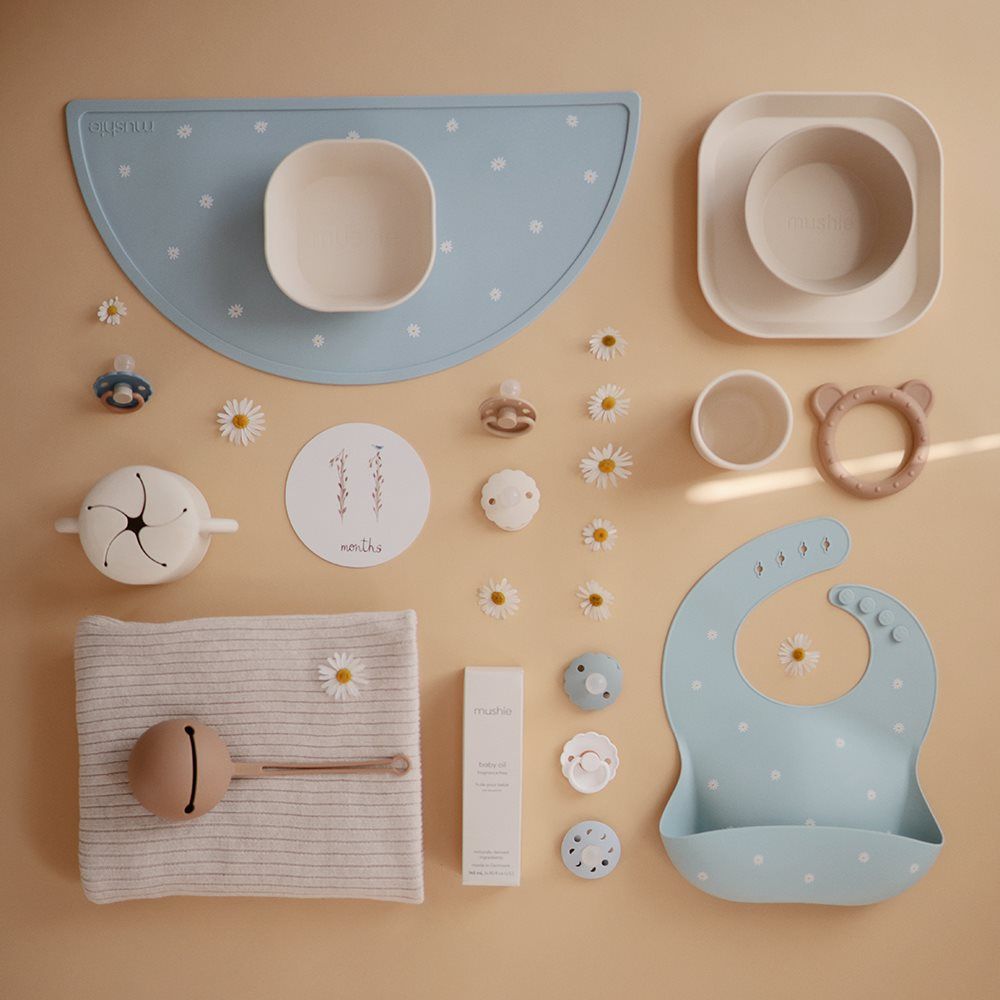 El mantelito de silicona para bebés Mushie es indispensable para las primeras comidas independientes de tu pequeño.
