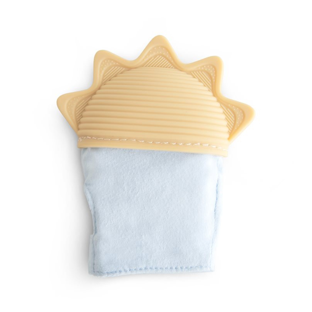 Este mordedor en forma de guante es una práctica ayuda para los niños pequeños que empiezan a morder y prefieren masticar con sus propias manos.