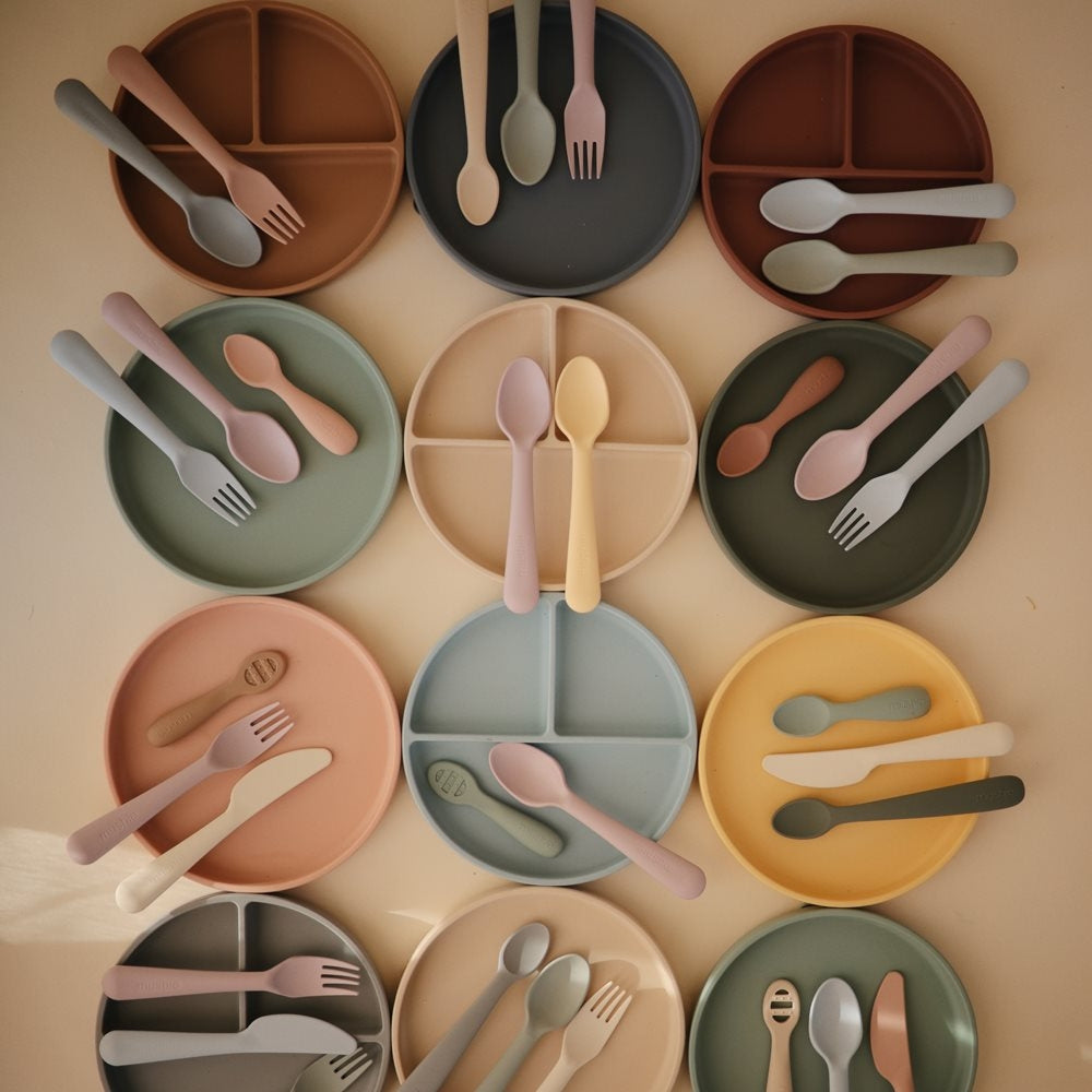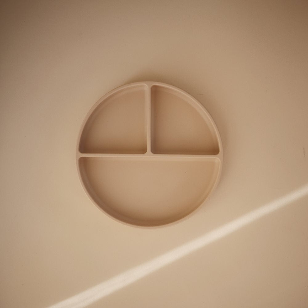Plato de silicona con ventosa Shifting Sand Mushie diseñado para las primeras comidas independientes del bebé.