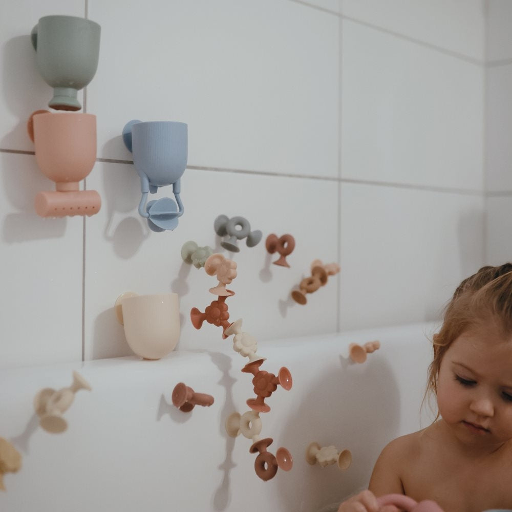 Cada vaso del set viene con una ventosa de silicona, para que tu hijo pueda fijarlo a las paredes de la bañera y experimentar con el flujo de agua.