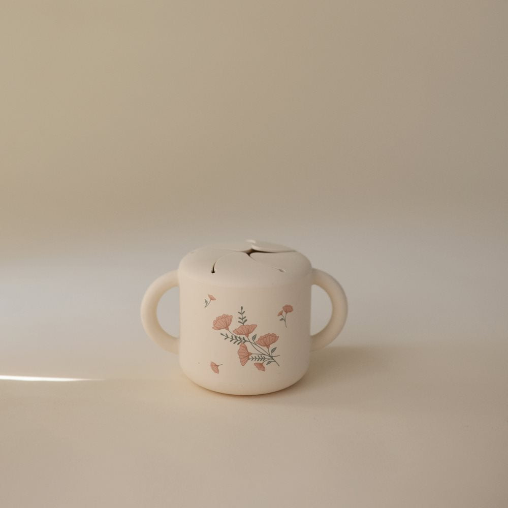 Vaso con boquilla para meriendas Pink Flower de Mushie.