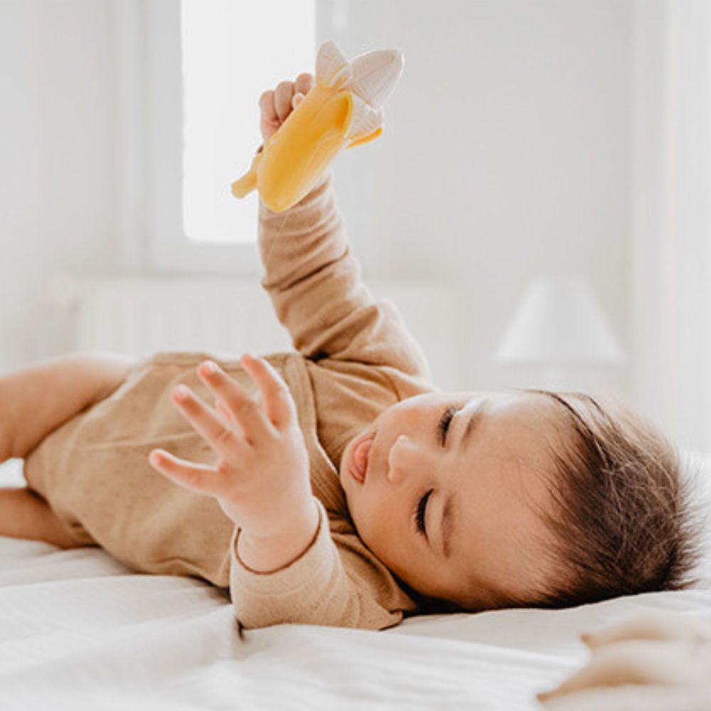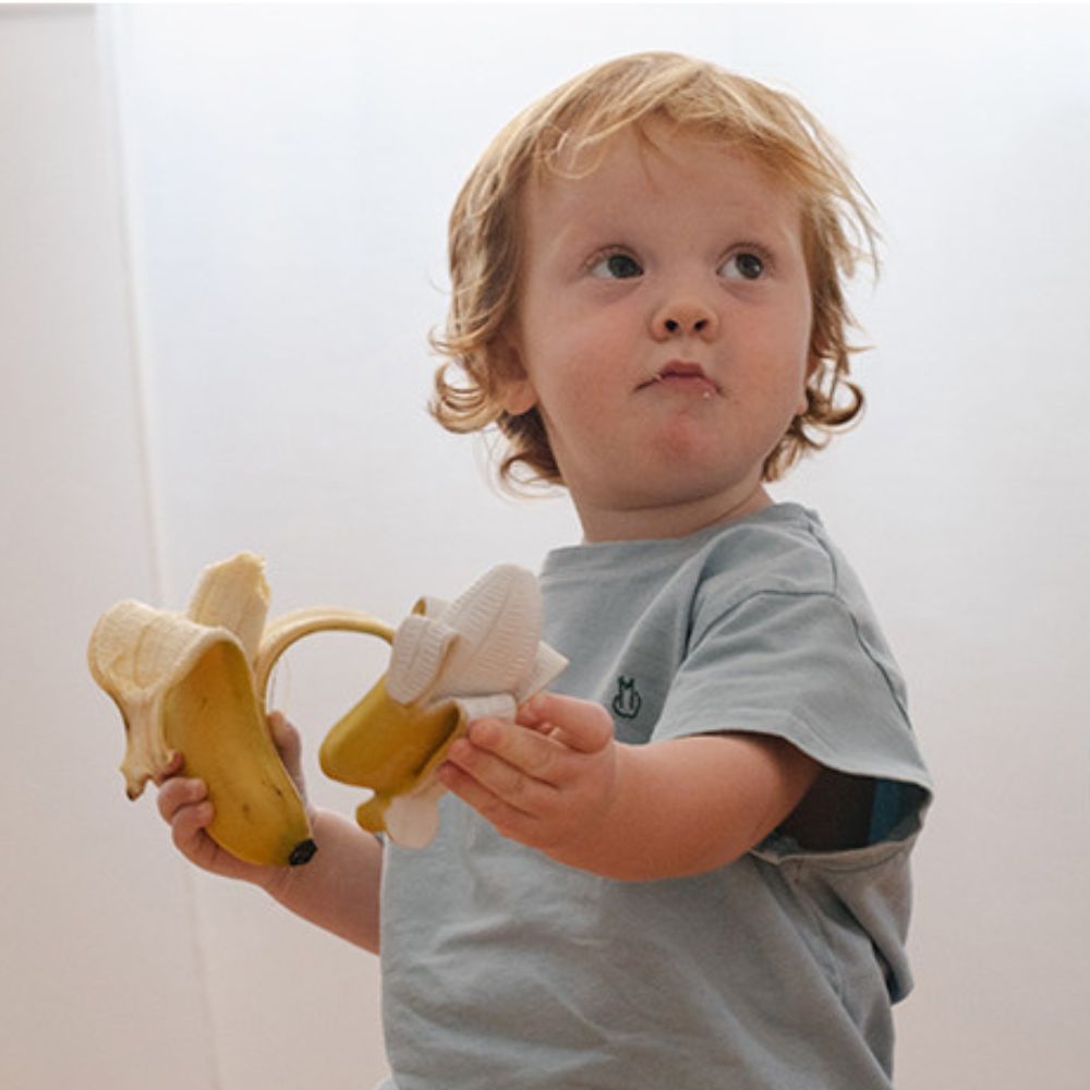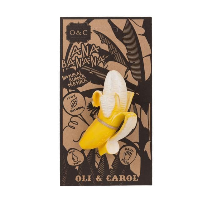 El mordedor para bebés Banana Ana Oli&,Carol, fabricado en caucho natural, es un mordedor perfectamente diseñado que masajea suavemente las encías del bebé para favorecer su correcto desarrollo.