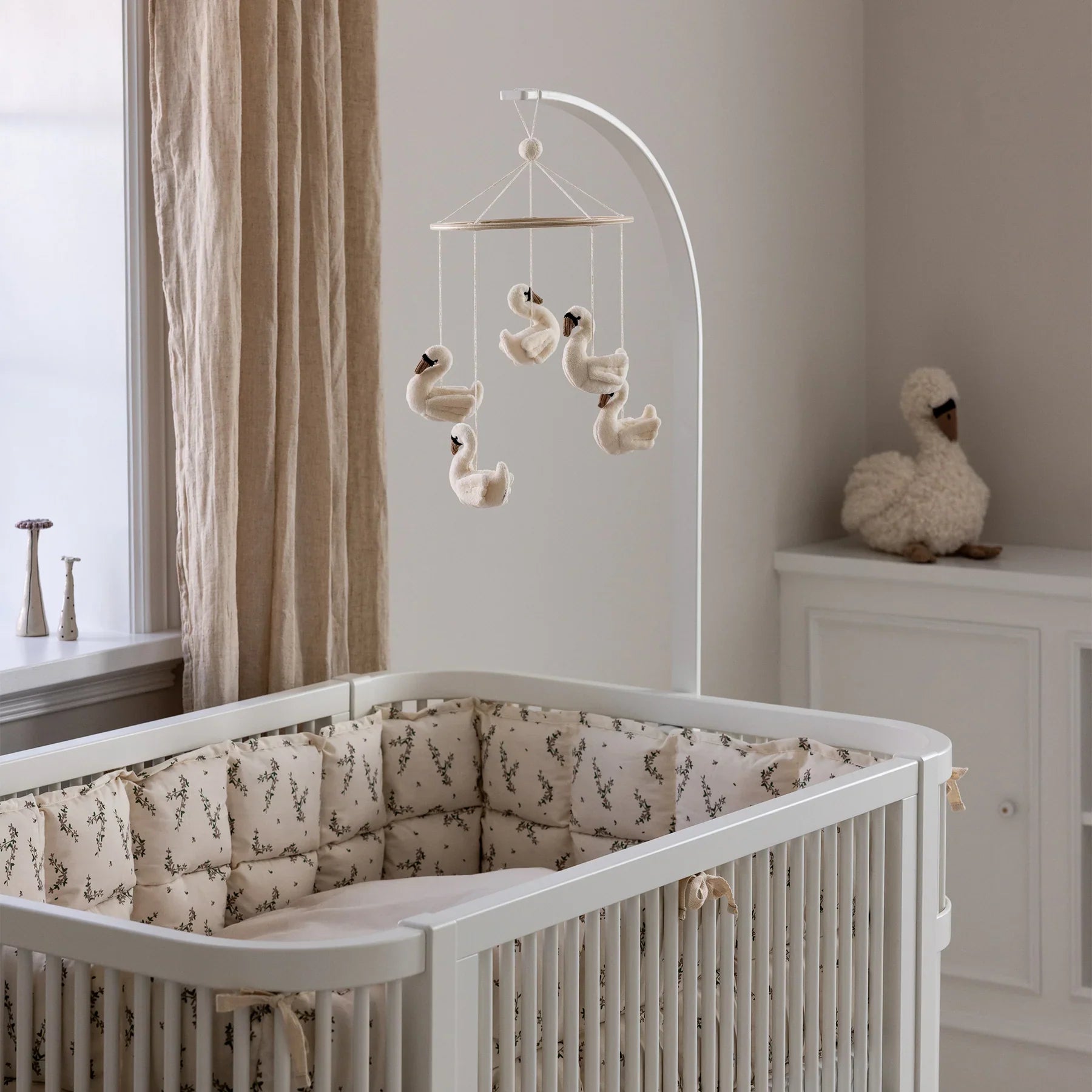 El carrusel de cuna Sebra con cinco suaves cisnes flotando sobre un delicado aro de madera es una forma encantadora de crear un ambiente tranquilo y relajante encima de la cuna o el cambiador.
