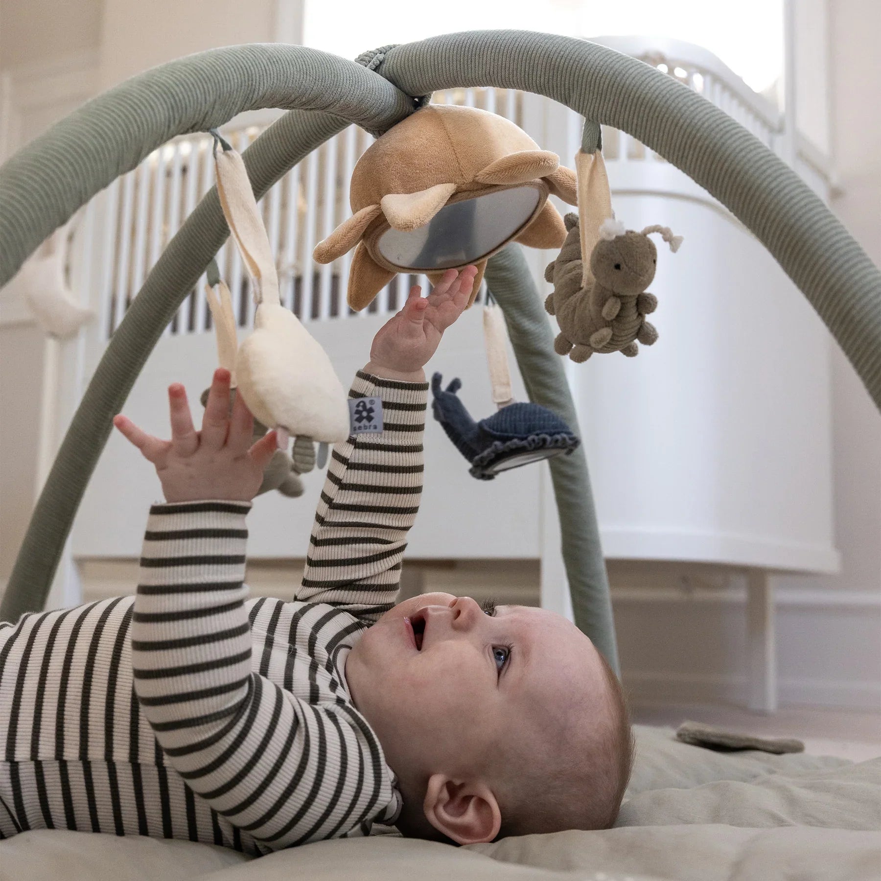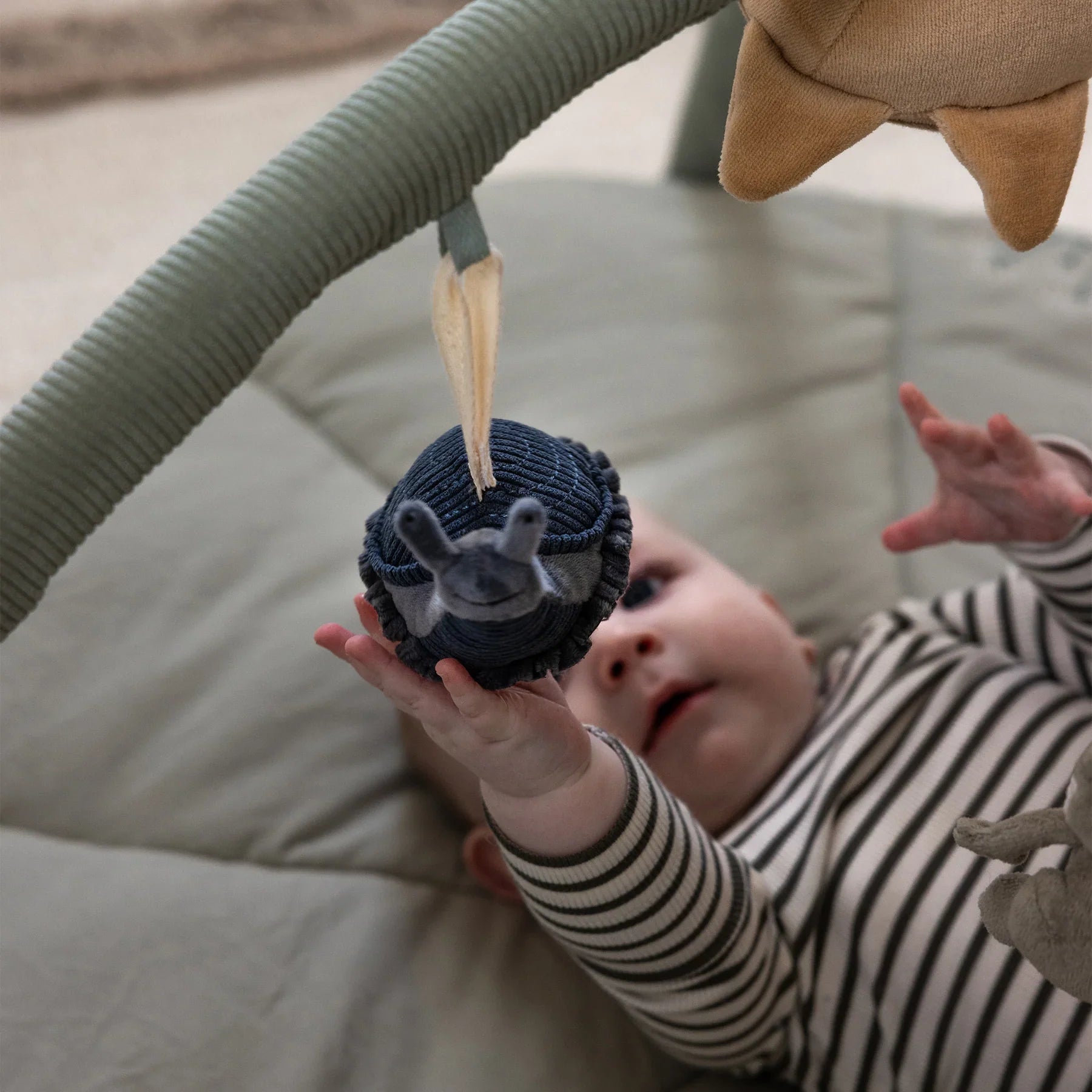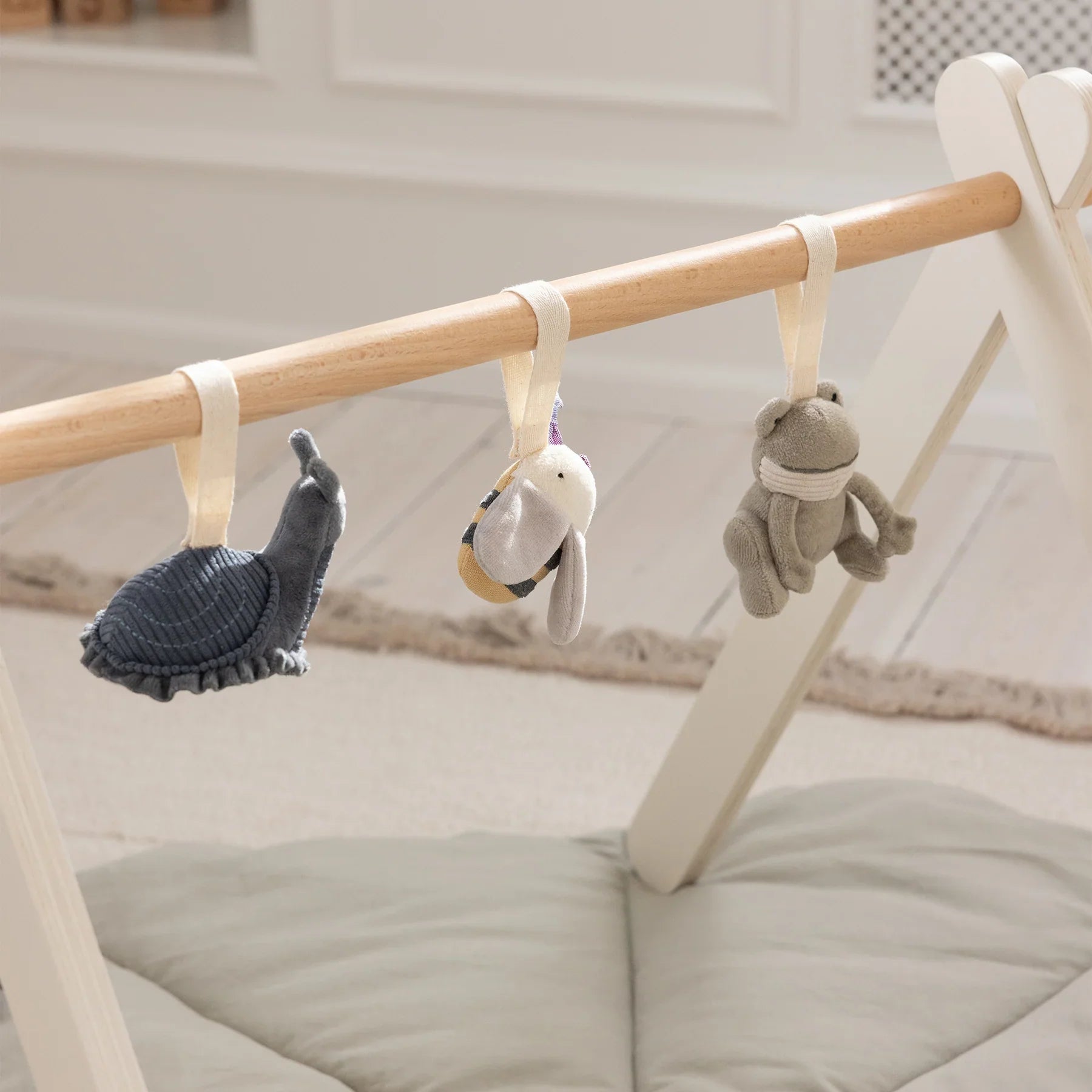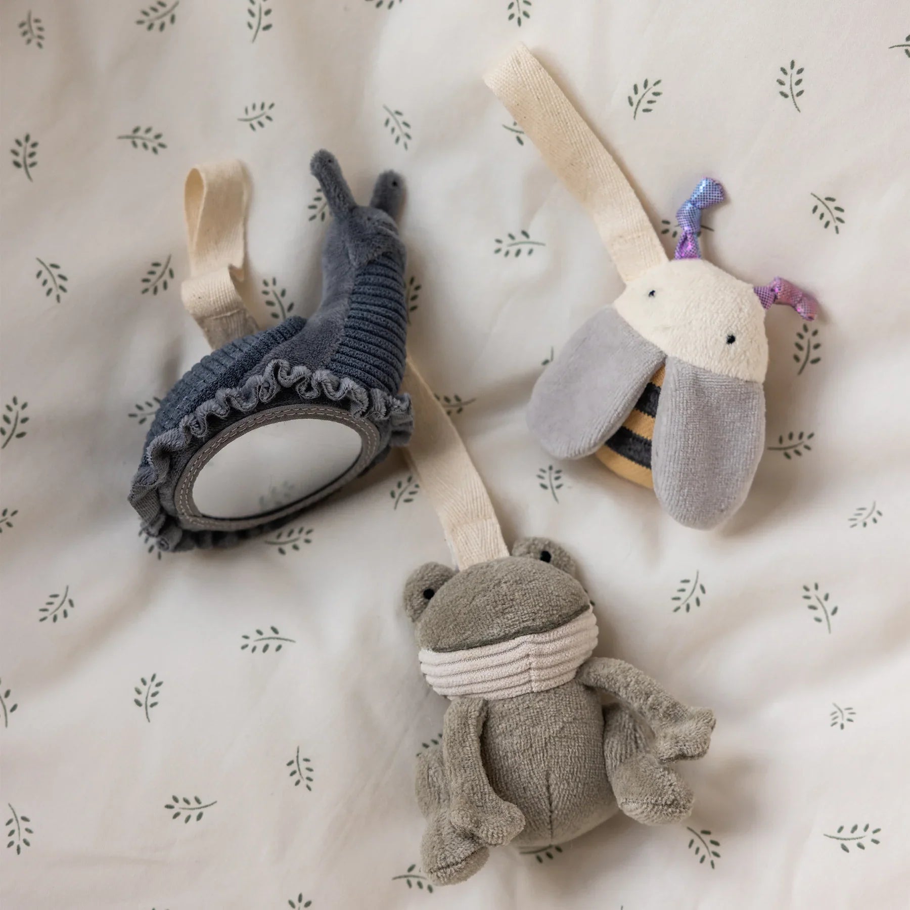 El conjunto incluye una rana con sonidos chirriantes, una abeja con un sonajero y un caracol con un espejo seguro para el bebé.