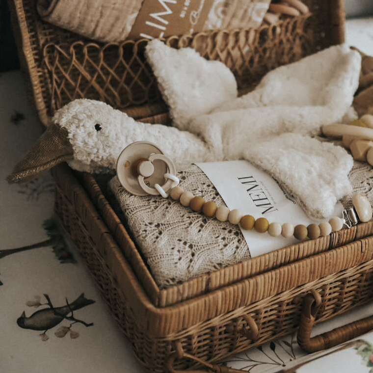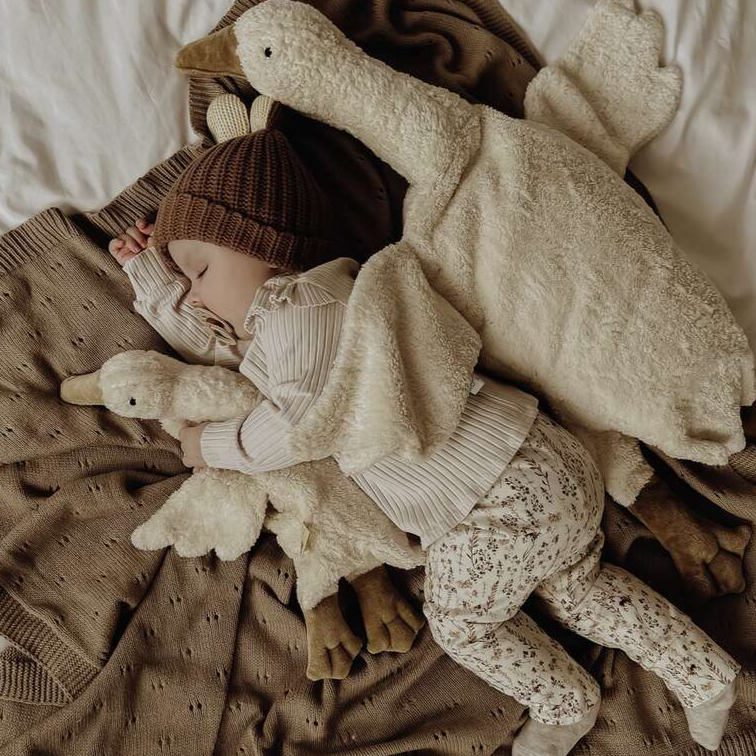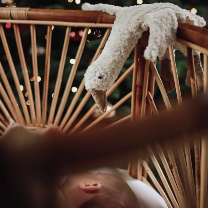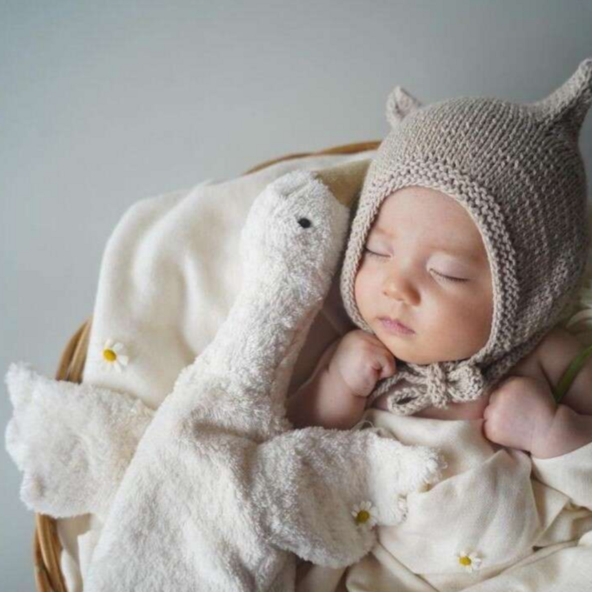 El peluche Goose Small White, hecho a mano, es ideal para bebés a partir de 2 meses.