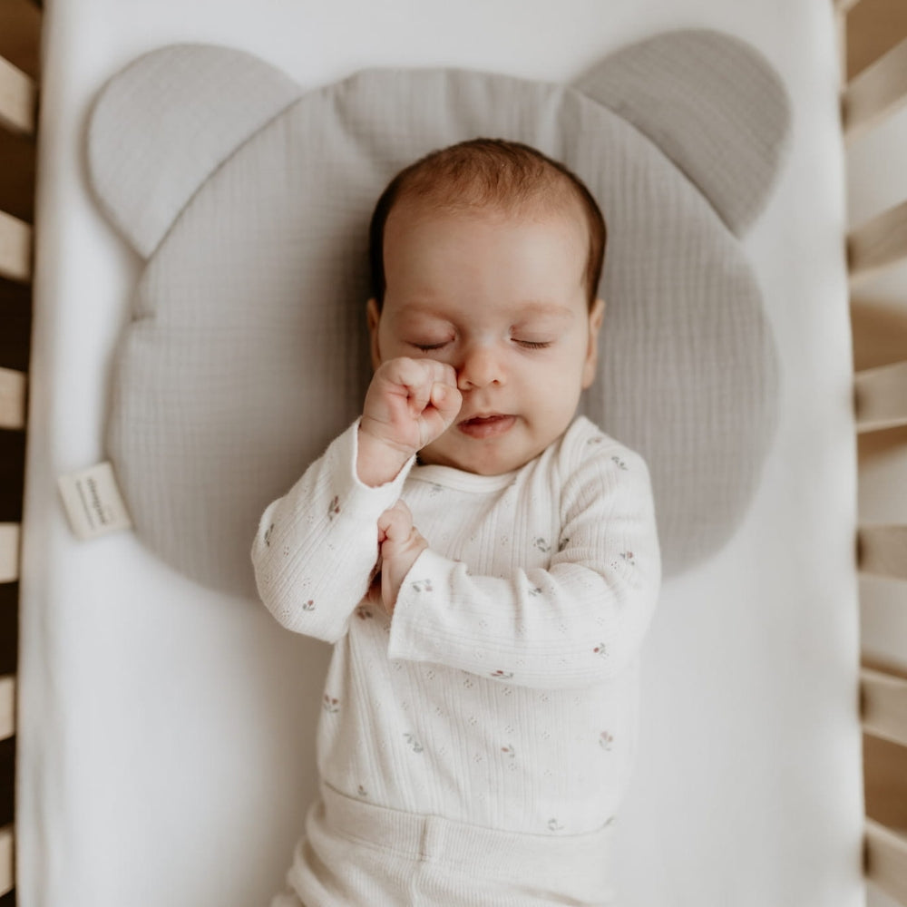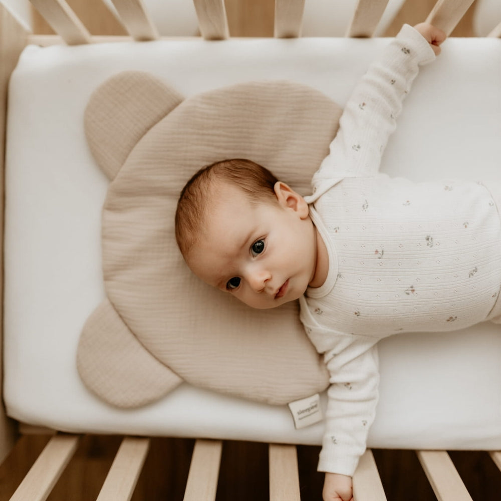 La almohada Sleepee Baby Pillow está fabricada en muselina de algodón y tiene la forma de la cabeza de un osito de peluche.