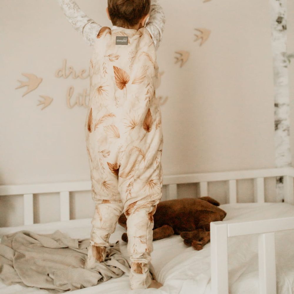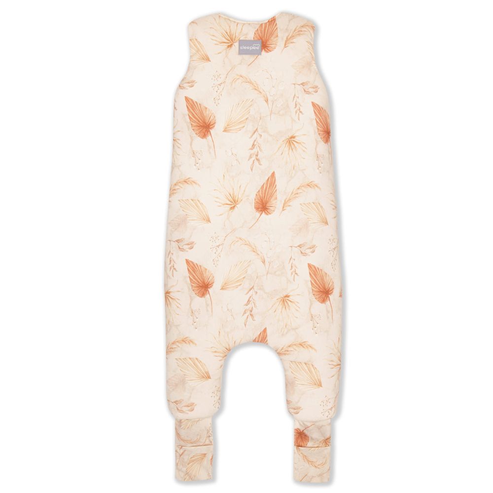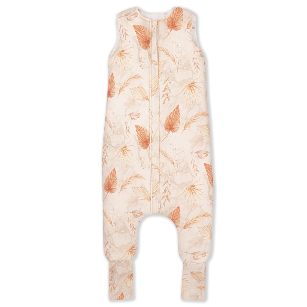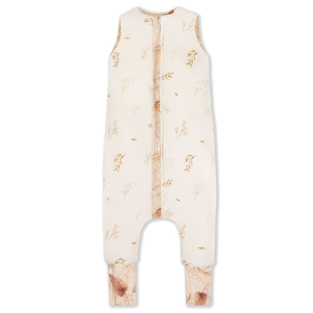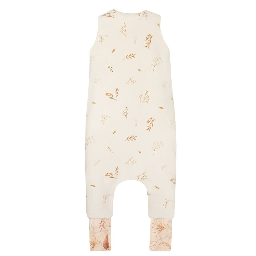 Bonito saco de dormir bohemio Sleepee de doble cara, con pies, en color arena y con motivos botánicos.