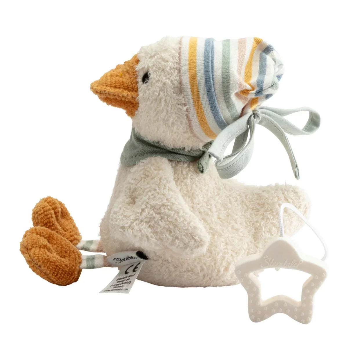 Fabricado con tejidos excepcionalmente suaves y decorado con adorables detalles, como ojos de botón y una silla de montar cuidadosamente acabada, el patito de Sterntaler llama la atención y anima a abrazarlo.