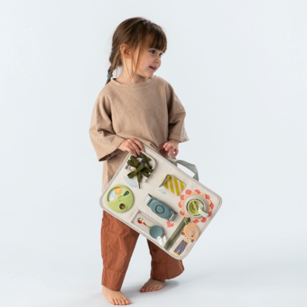 Gracias a su práctico asa, el tablero educativo de Taf Toys es perfecto tanto para casa como para llevar de viaje.