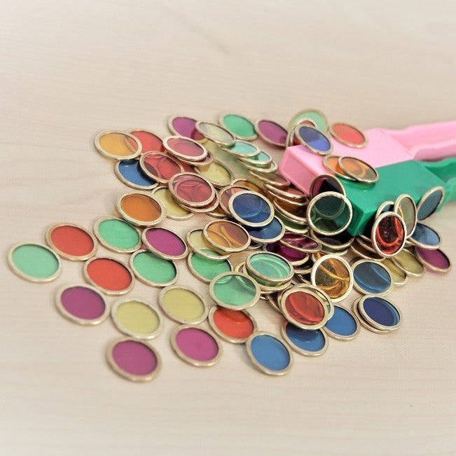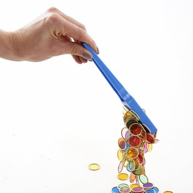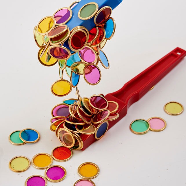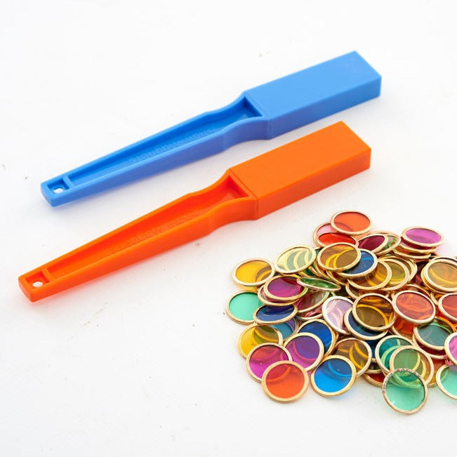 Juego de destreza compuesto por 2 varitas magnéticas y 100 fichas de plástico de colores con bordes metálicos.