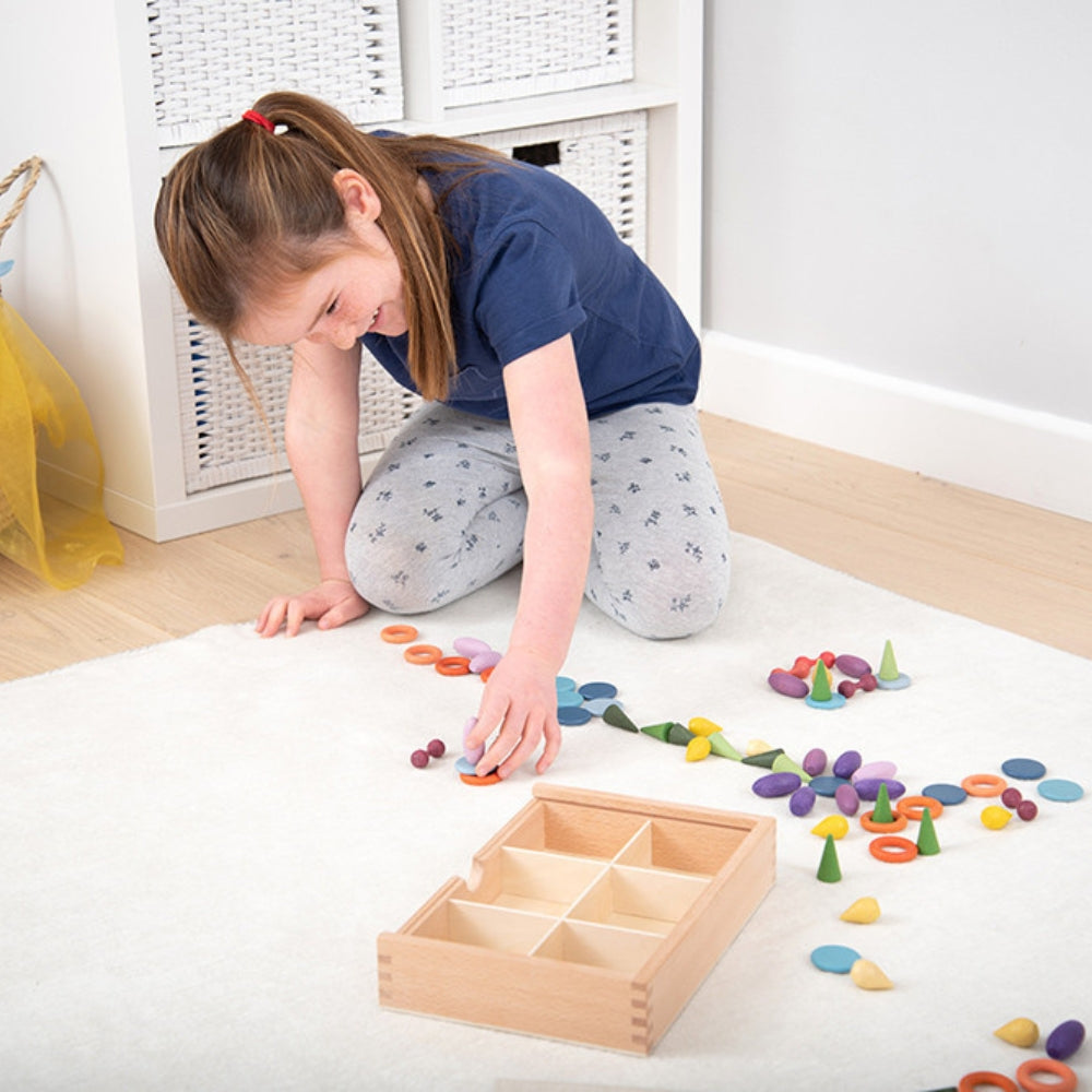 La colección de tesoros especiales de madera lisa, junto con la bandeja clasificadora de madera, es un inspirador conjunto diseñado para desarrollar la imaginación, la lógica, la creatividad, la coordinación y las habilidades motoras.