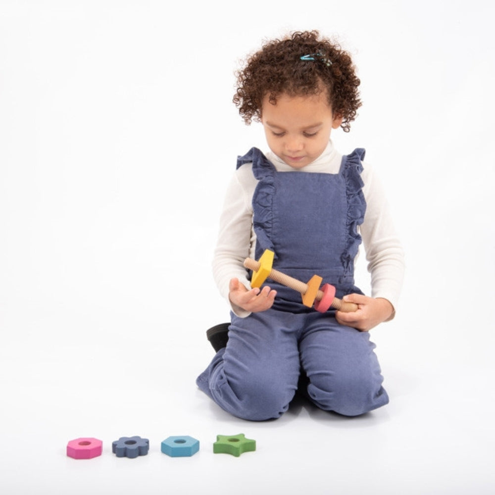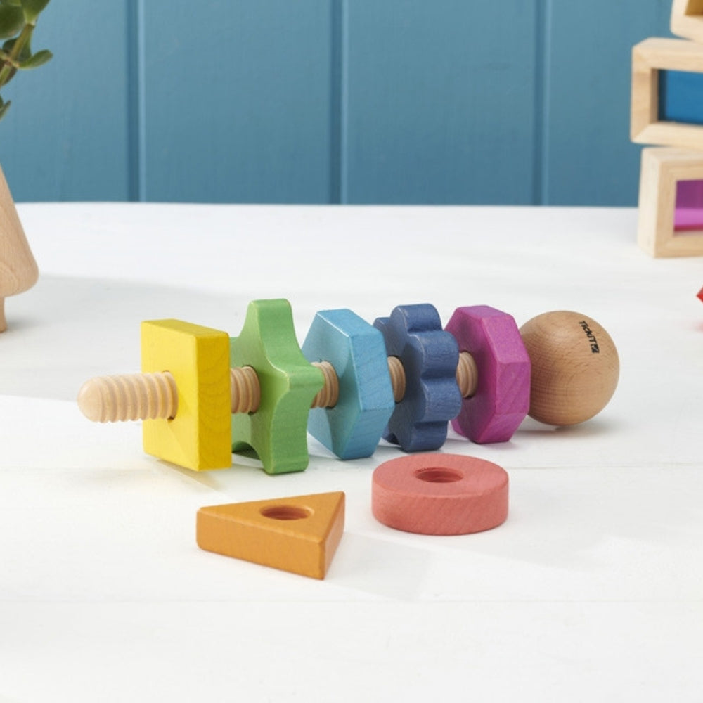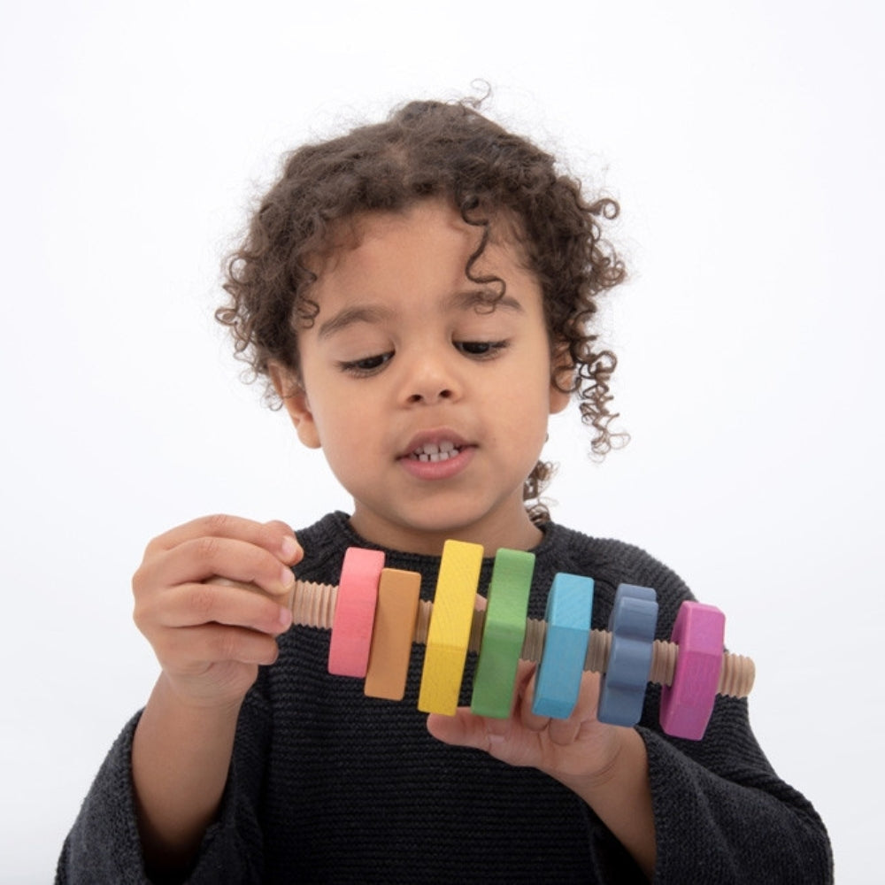 Un bonito tornillo gigante hecho de madera maciza de haya, con siete tuercas de diferentes formas y siete colores del arcoíris.