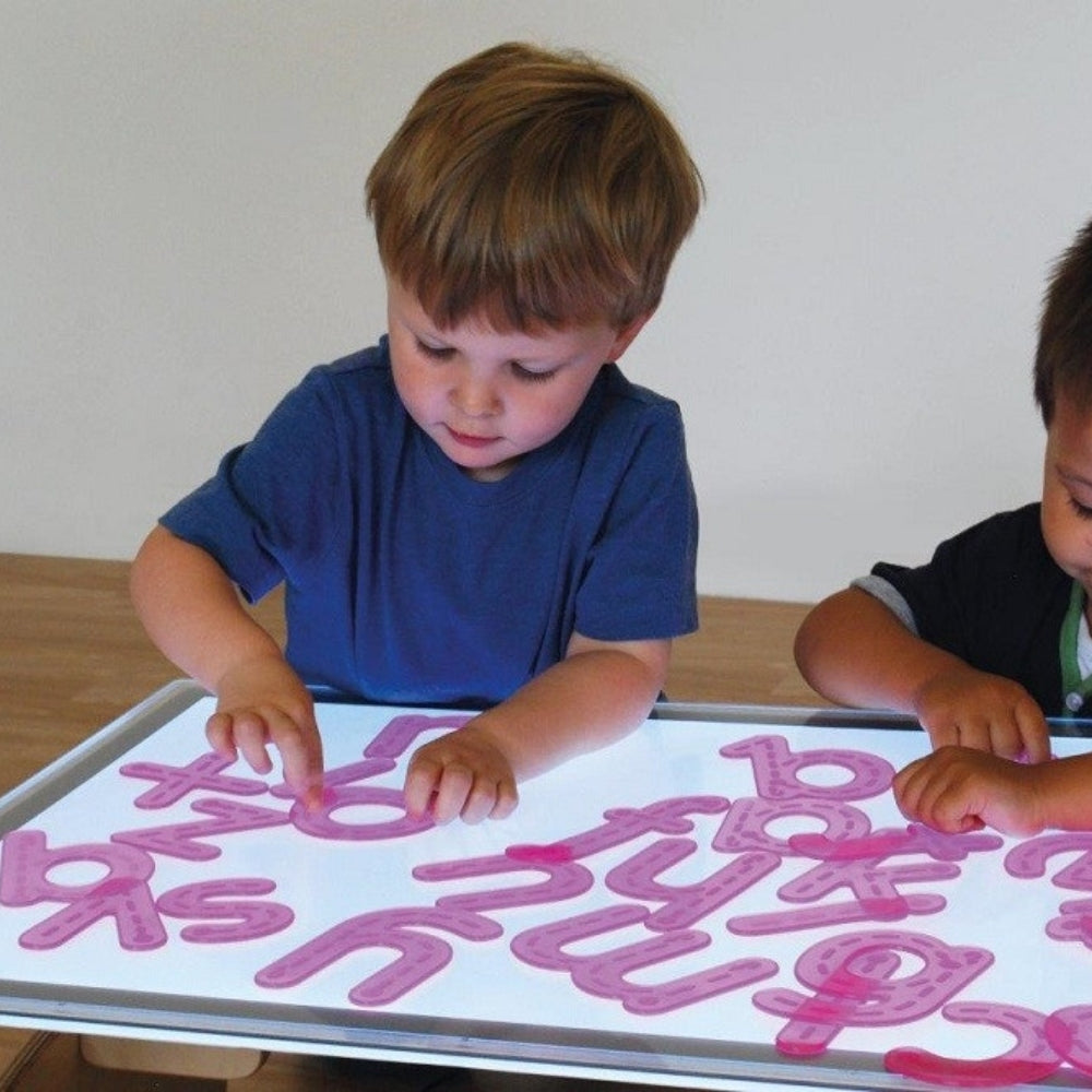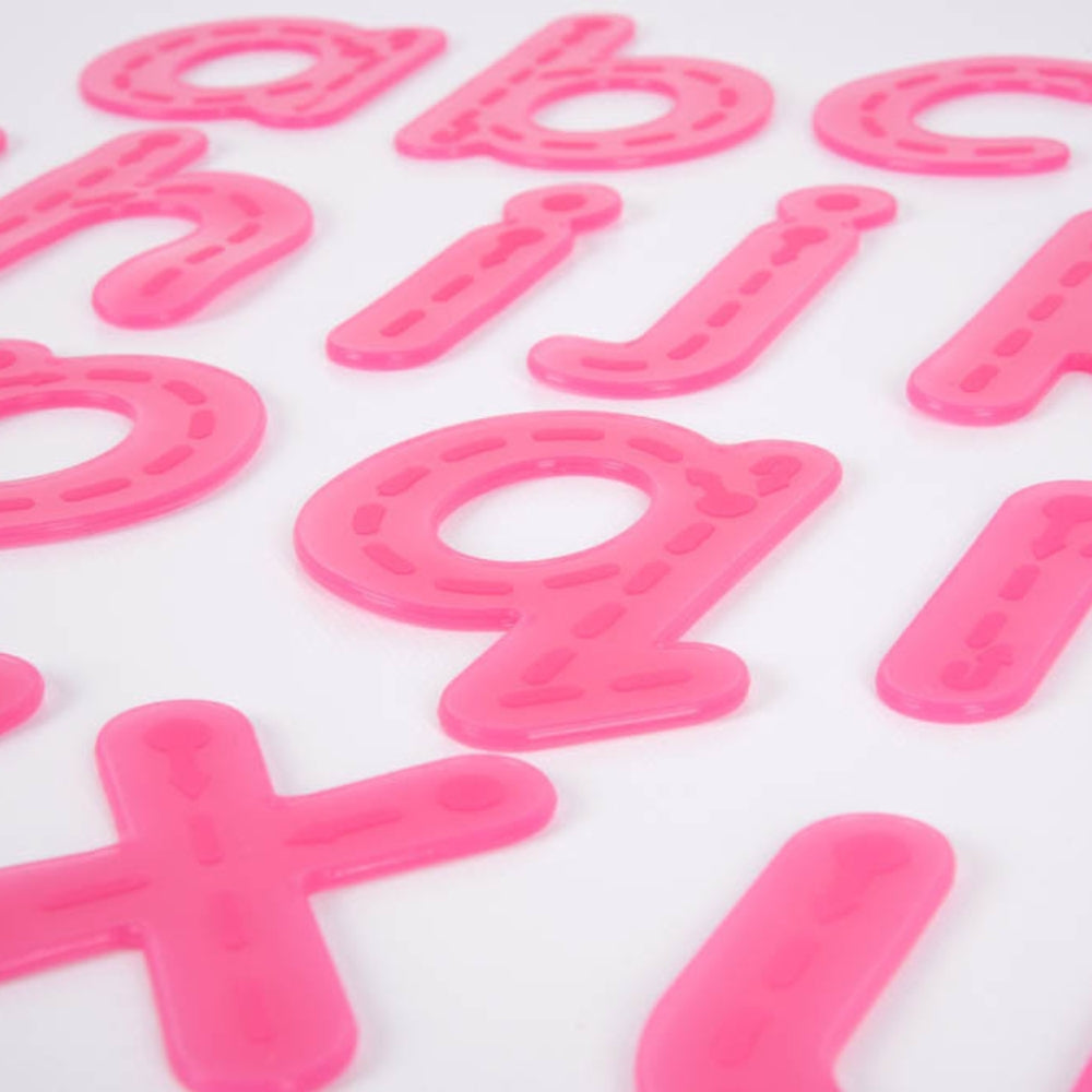 Las letras infantiles translúcidas de color rosa, fabricadas en silicona suave y flexible, son el complemento perfecto para el juego diario.