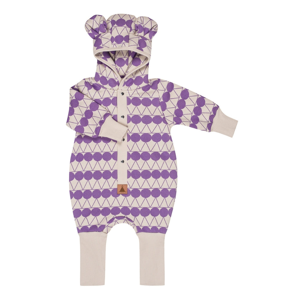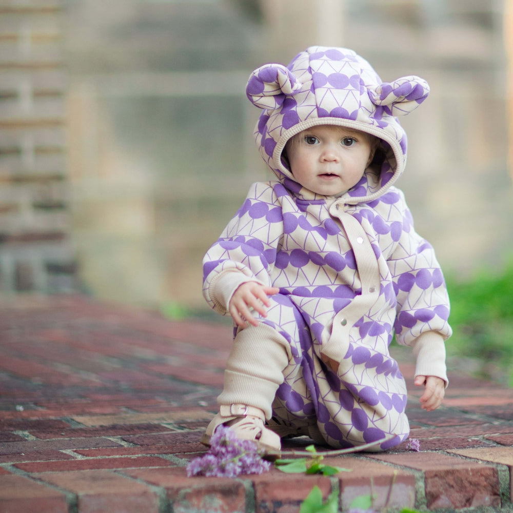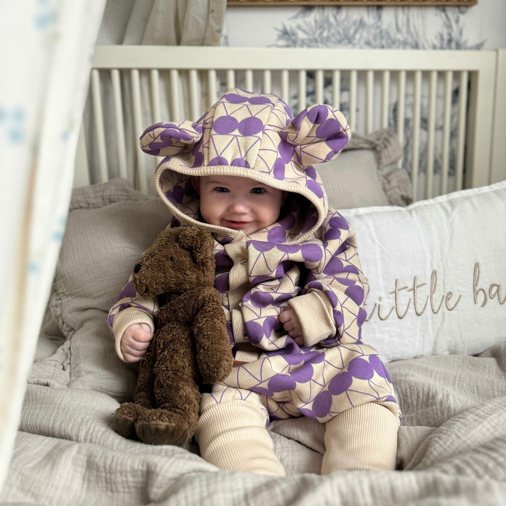 Confeccionado en un bonito color beige, el mono presenta lunares morados para que el bebé luzca aún más adorable.